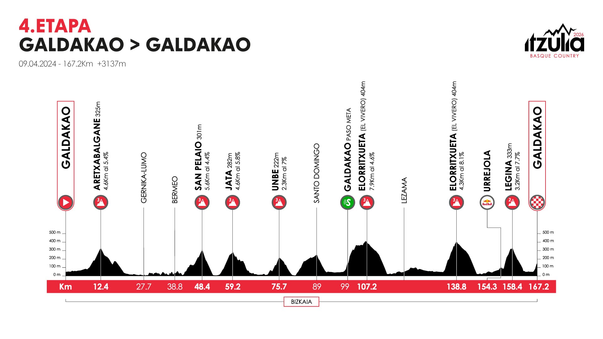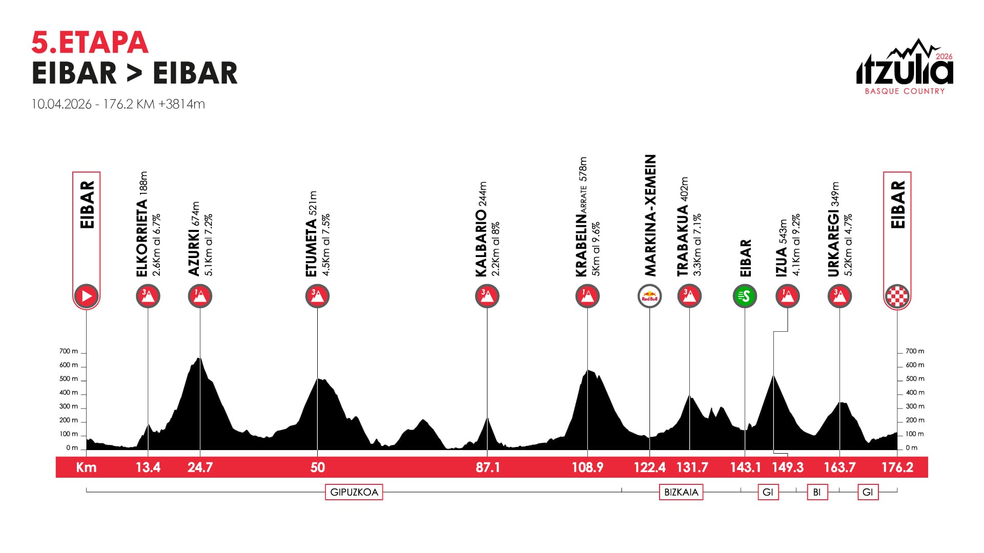 El verdadero punto decisivo llegará en la etapa de Eibar, la más larga y exigente de la Itzulia, con cerca de 170 km y ocho puertos, tres de ellos de 1.ª categoría: Azurki, Krabekin e Izua. Es aquí donde se esperan los ataques que definirán la carrera, y donde los favoritos deberán dar la cara.