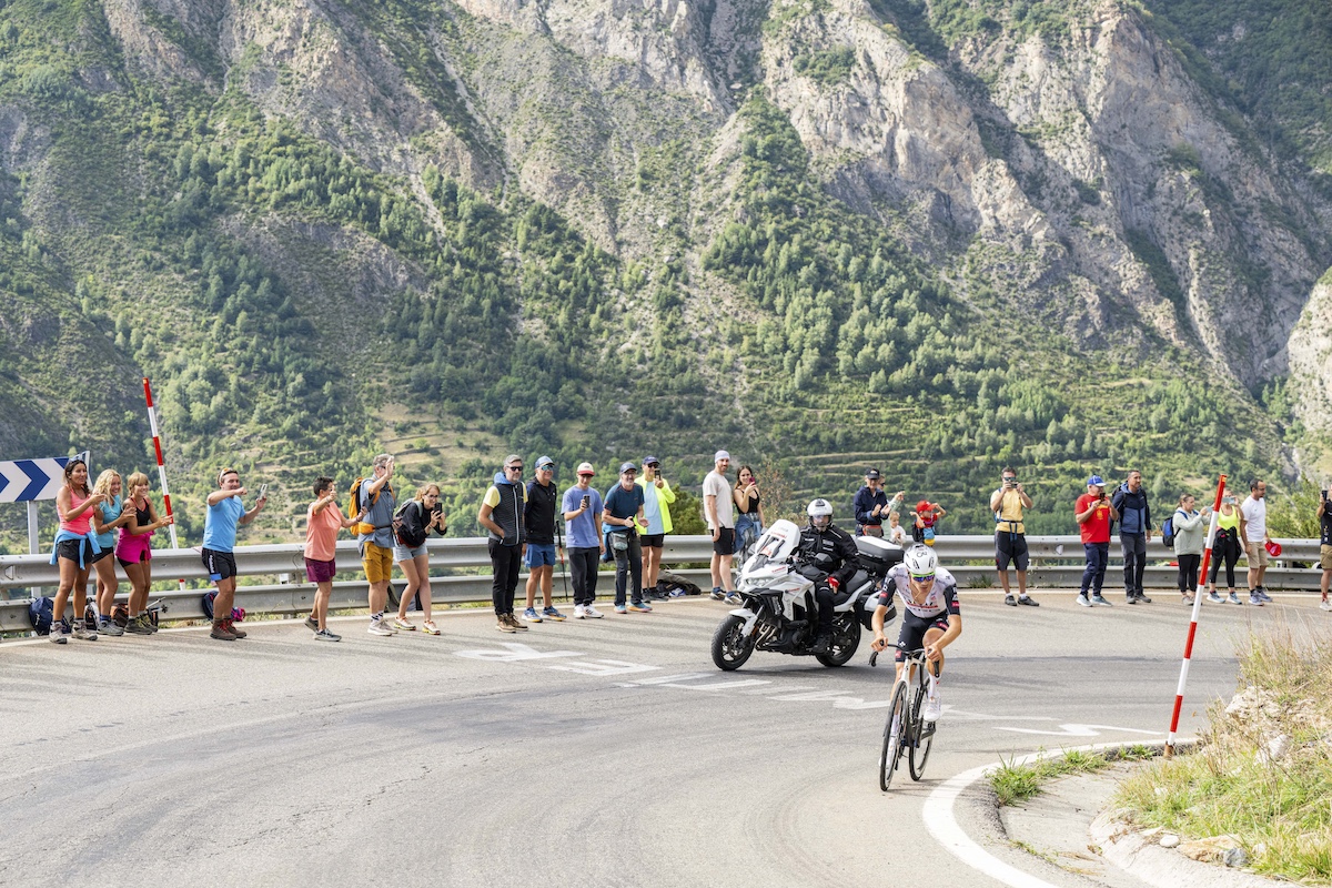 El guion de la etapa se escribió muy pronto y tuvo un arrebato como mecha. “Un corredor del Visma me había dicho que no me dejarían irme en la fuga, que todavía pensaban que podía luchar por la general. Así que decidí inmolarme en la primera subida e irme por patas. Pero en la primera hora de carrera, que la he hecho solo, he sufrido mucho”, reconoció el corredor del UAE. Pronto otros ciclistas lo alcanzarían para formar una fuga, entre los que destacaban el propio Ayuso, Jay Vine, Mads Pedersen —que lucha por la regularidad— o Raúl García Pierna. La escapada, con permiso del pelotón que controlaba Bahrain Victorious, se consolidó con casi cuatro minutos de renta. Vine, ganador el día anterior en Pal, aprovechó para amarrar la clasificación de la montaña, mientras actuaba como gregario de Ayuso, que se reservaba para la gran subida final a Cerler.