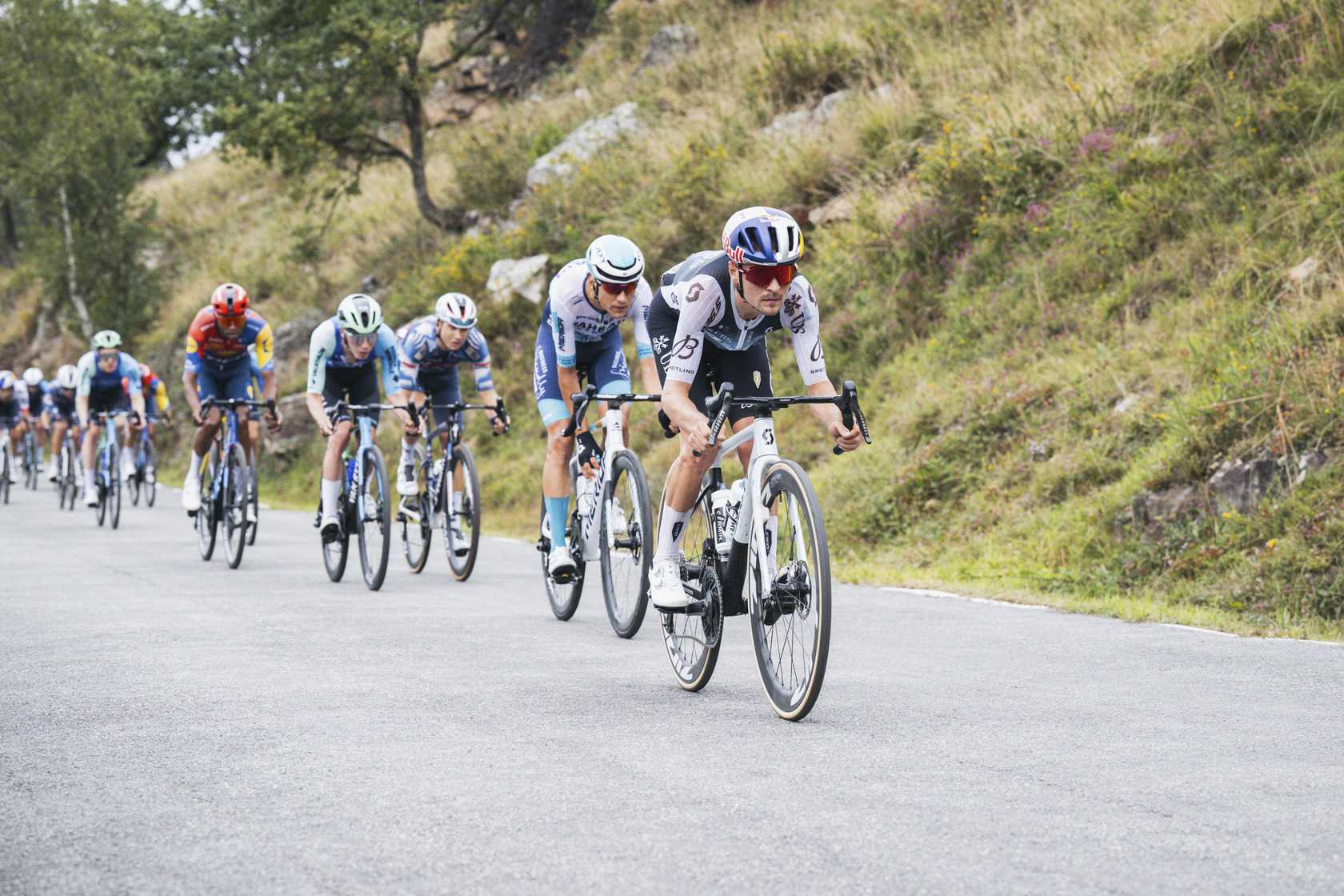 El día arrancó con la tensión propia de las etapas que prometen batalla y, además, con ciertas implicaciones sentimentales para muchos corredores, que en categoría de juveniles habían corrido por esas carreteras. El Puerto de Alisas, con sus rampas sostenidas y su carretera encajonada, fue el primer filtro. Allí, tanto Movistar como UAE mostraron sus cartas: Marc Soler y Javier Romo delante, Ayuso atento a los movimientos, y un pelotón que, bajo el mando del Visma de Jonas Vingegaard, no estaba dispuesto a regalar nada más de lo necesario. La fuga, sin embargo, alcanzó proporciones gigantescas, con figuras como Mads Pedersen, Santiago Buitrago, Mikel Landa y hasta cinco represetantes del Movistar, entre sus integrantes