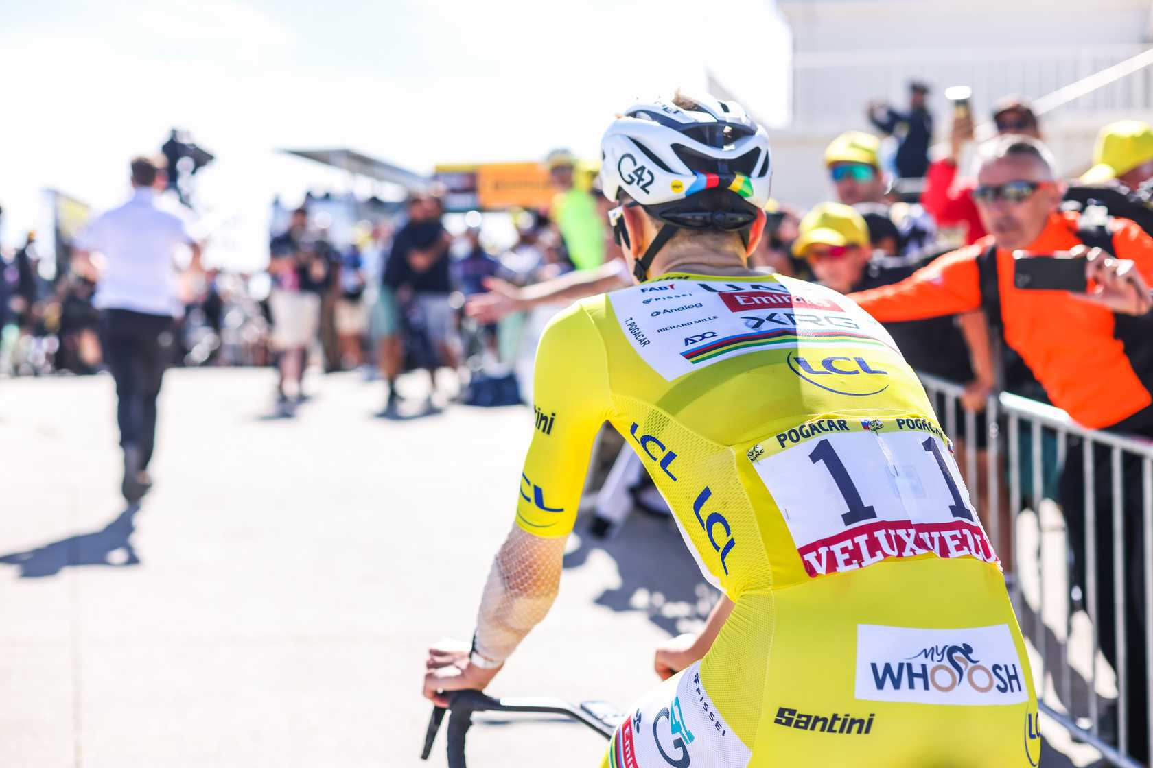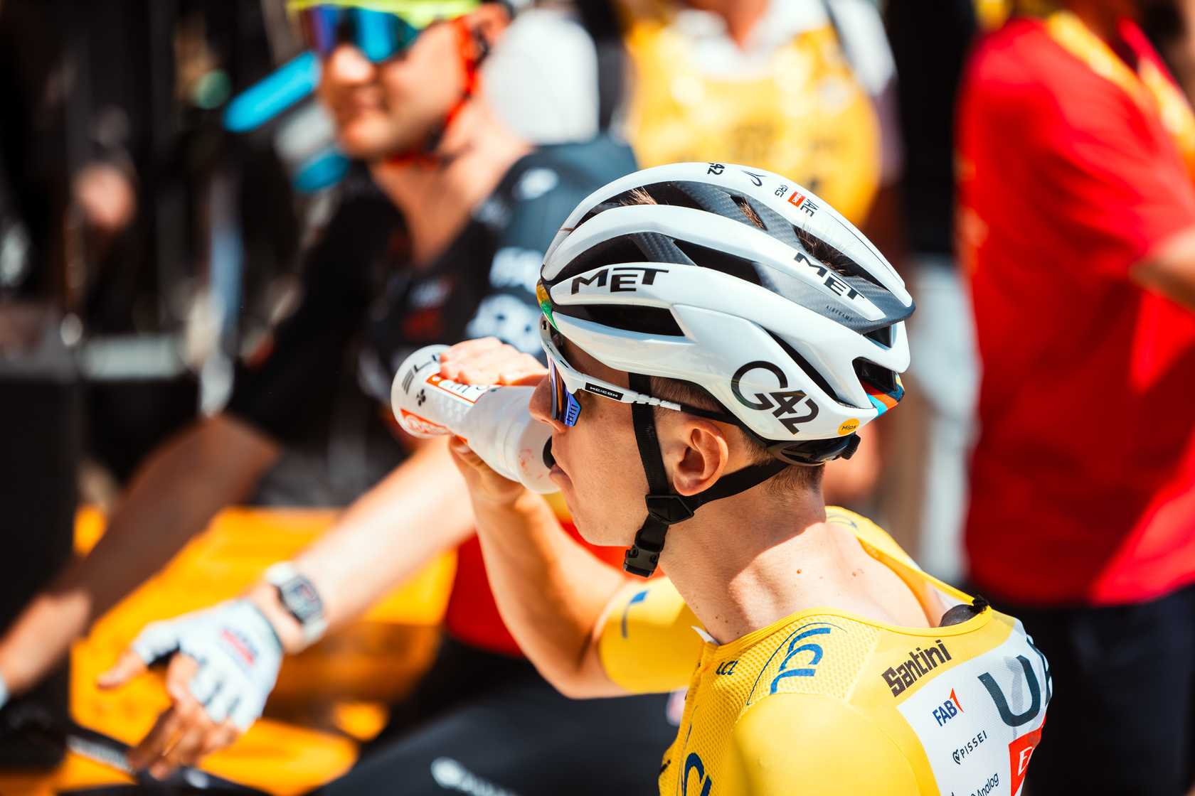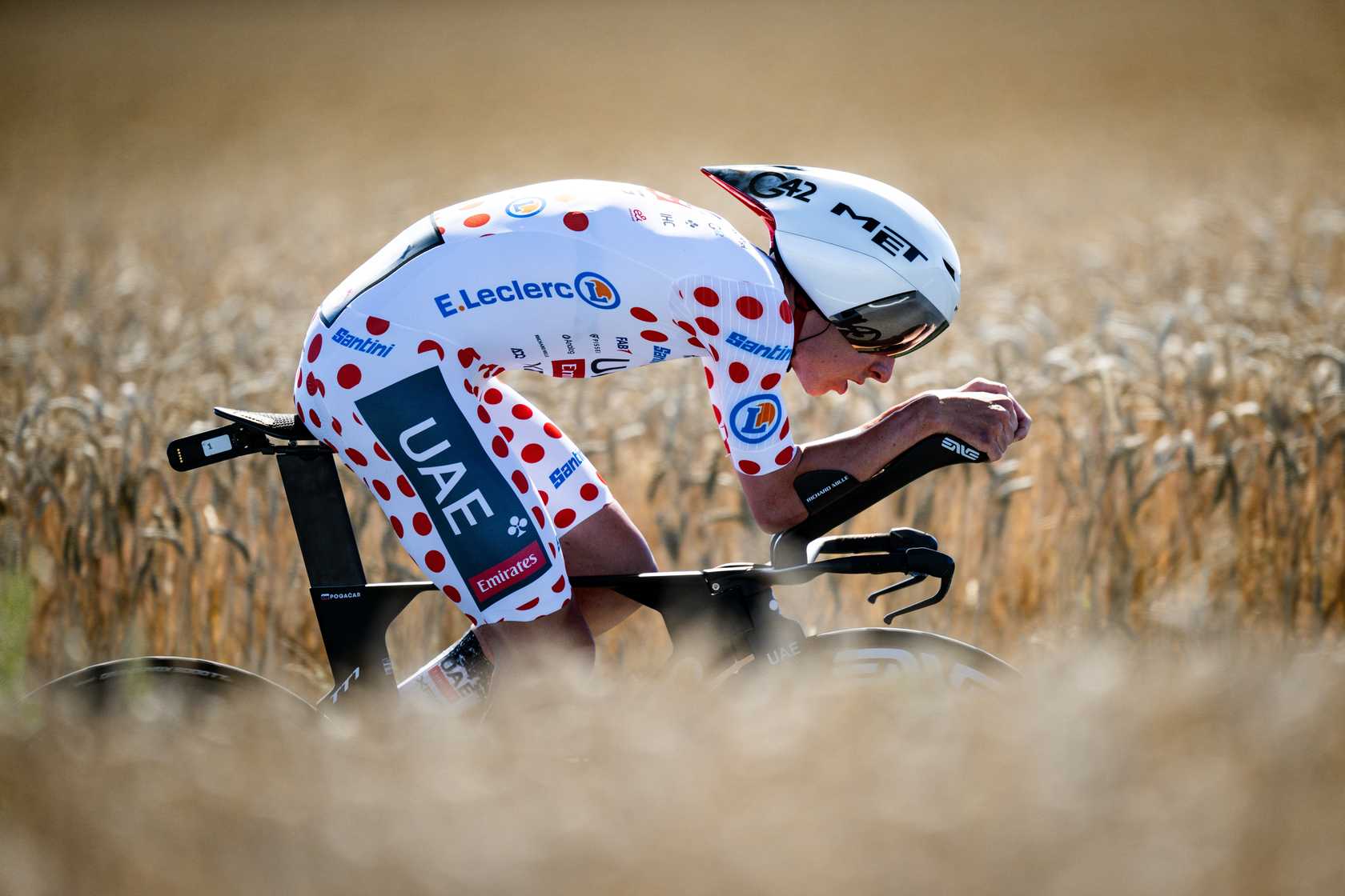 Para las etapas contrarreloj, hemos visto que Pogačar ha utilizado el nuevo MET Drone Wide Body II, una evolución del casco de crono de la marca. Concretamente, en la crono de la quinta etapa entre Caen y Caen, en la que terminó segundo a 16'' de Remco Evenepoel, actual Campeón del Mundo de la especialidad. Este modelo incorpora una carcasa más envolvente con una cola alargada y un perfil lateral ampliado que mejora el flujo aerodinámico alrededor de los hombros. Además, cuenta con un sistema de ventilación frontal revisado que permite mantener una temperatura estable sin sacrificar la penetración en el aire. Su diseño ha sido optimizado específicamente para adaptarse a la posición del esloveno sobre la bicicleta de contrarreloj, maximizando la eficiencia en esfuerzos sostenidos de alta intensidad.